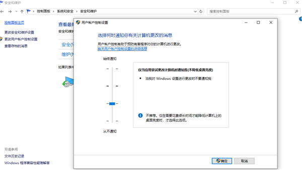 然后返回上一步再点击更改用户账户控制设置 → 拉到最低 点确定保持【至此控制面板所有设置完成】