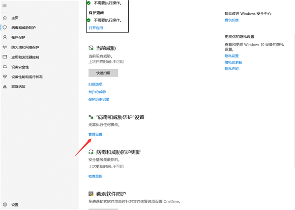 打开Windows安全中心,左侧边栏,点击病毒和威胁防护,找到并点击“病毒和威胁防护”设置下的管理设置